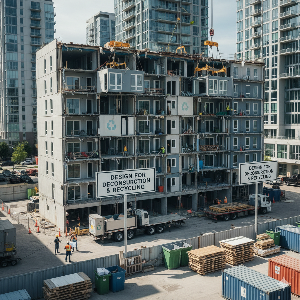 つまり、設計段階から建物の寿命後に構成部材(鉄骨、外装パネル、窓など)を原形のまま取り外し、再利用・再資源化できるように計画します。♻️