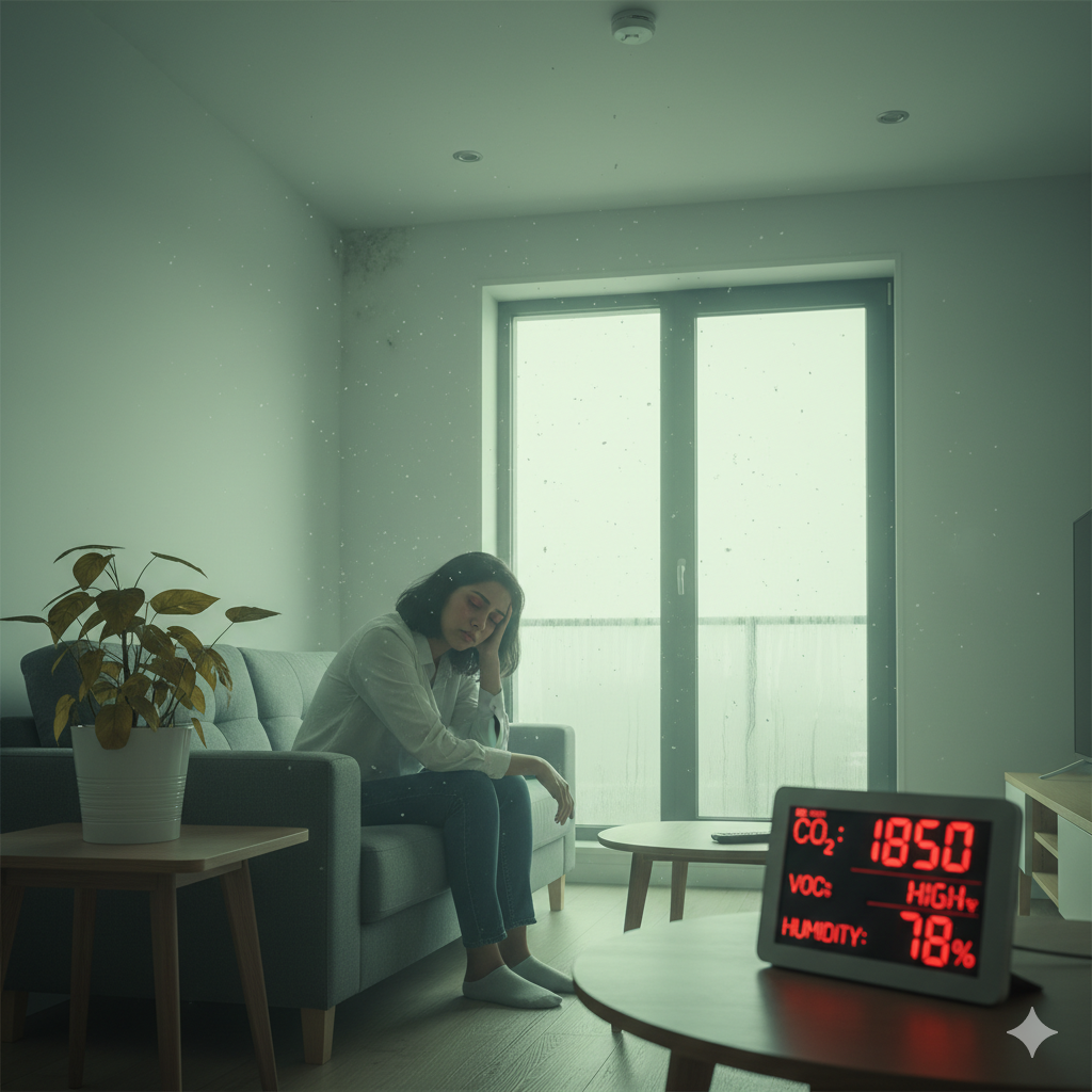 - Kết quả: Chất lượng không khí trong nhà trở nên rất tệ, có thể gây ra các vấnEđề sức khỏe như "Hội chứng tòa nhà kín" (Sick Building Syndrome), gây mệt mỏi, đau đầu, dị ứng. 😟